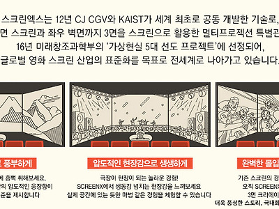 영화관에서 전방 스크린뿐 아니라 좌우 벽면을 동시에 스크린으로 활용하는 상영시스템을 말한다. Screen X 2013년 CJ CGV, 한국과학기술원(KAIST)이 공동 개발에 성공한 세계 최초의 다면 상영시스템으로, 2013년 부산국제영화제에서 영화 를 스크린X 기술로 상영하면서 처음 공개됐다. 이 기술은 미래창조과학부(현, 과학기술정보통신부)가 2016년 ‘가상현실 5대 선도 프로젝트’로 선정하기도 했다. 기존 극장이 정면 하나의 스크린만을 사용했다면 스크린X는 정면 스크린뿐 아니라 양 옆 벽면까지 사용해 3면 스크린을 구현한다. 3면 스크린을 활용함으로써 관객들에게 마치 영화 속에 들어온 것과 같은 몰입감을 제공하는 것이 특징이다. 스크린X는 2018년 7월을 기준으로 국내 50개 극장 83개관을 보..